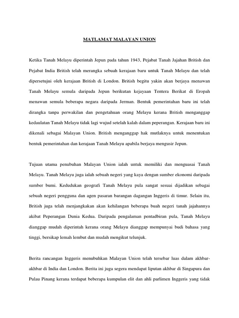 Kawal kuasa politik melayu yang bekerjasama dgn jepun. Malayan union merupakan pertubuhan negara dana bangsa yang diperkenalkan oleh british pada tahun 1946 untuk menghapuskan negara dan bangsa melayu yang dibina sejak zaman kesultanan melayu melaka. Tanah melayu juga ialah sebuah negeri yang kaya dengan sumber ekonomi daripada sumber bumi. Ditubuhkan pada 1 april 1946. Start by marking sejarah penubuhan malayan union as want to read