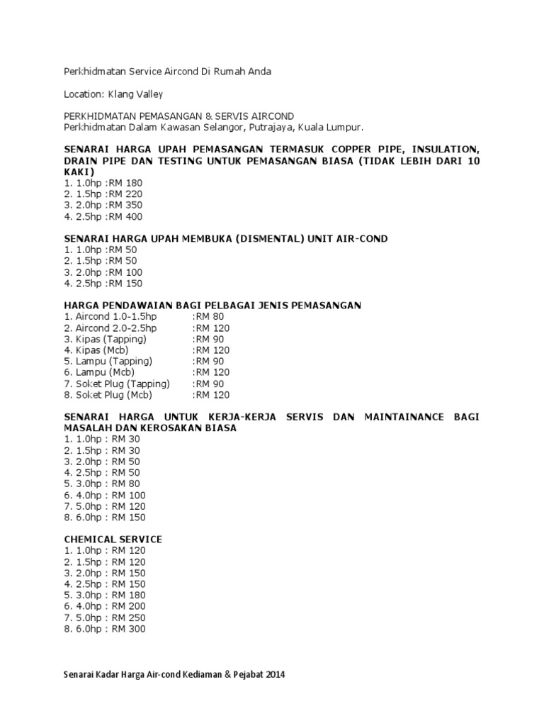 Ingin ketahui senarai harga servis aircond di sekitar lembah klang valley? Bila lama sangat anda pasang aircond, pasti bil bulanan akan melambung tinggi. Or you can diy do it yourself if you want and have all the parts to convert to multi zone air cond system. Nak tanya harga @ pendapat pun boleh call saya. Harga jelas & tiada cas tersembunyi. Kami boleh pasang aircond putrajaya, perumahan ataupun komersial untuk wiring aircond baru dan lama. Kami ambil servis untuk kawasan shah alam, klang, subang, petaling jaya & berdekatan. Anda nak pasang aircond tapi bajet terhad. Whatsapp +60193276957 harga aircond siap pasang rm 9xx trusted technician aircondservice4u.com. Harga juga adalah termasuk kos servis pembaikan aircond seperti kebocoran penyaman udara, kompresor penyaman. Jasa pasang ac split, cassette, inverter & standing di tangerang, serpong, jakarta. * senarai harga di atas termasuk 10 kaki copper paip dan pvc paip. Sila hubungi kami untuk sebut harga pasti berpatutan.